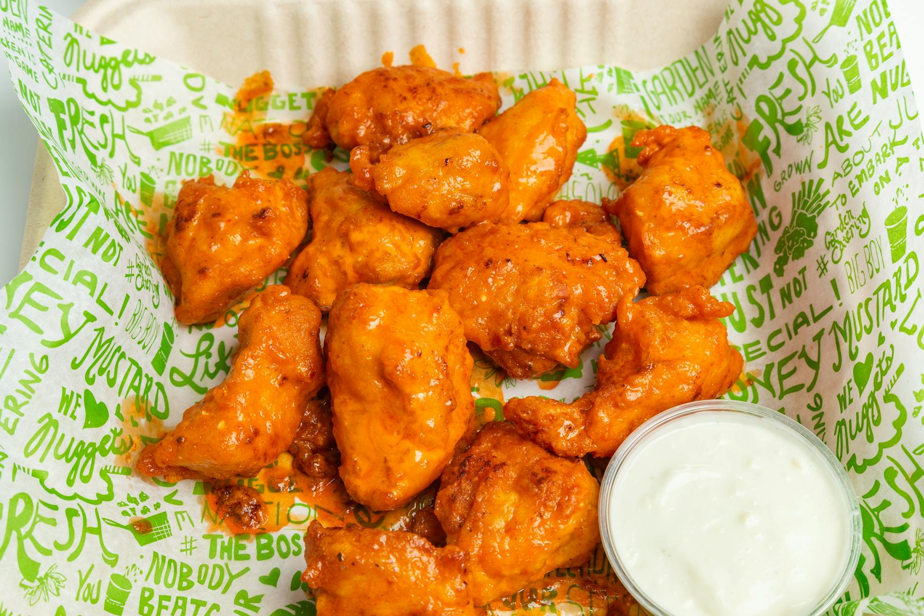 100 white meat chicken with NO antibiotics ever hand-cut daily and cooked to perfection.